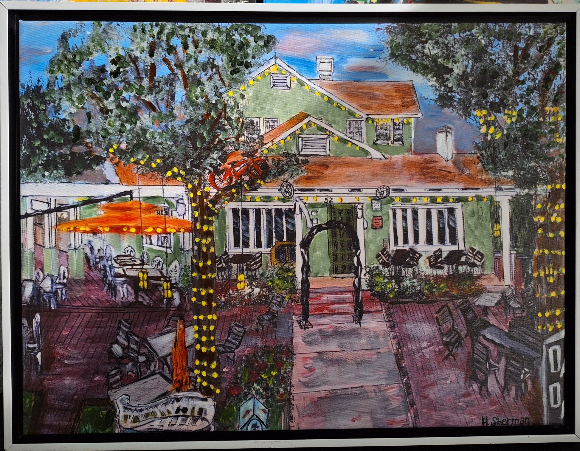 DA-DA'S -Giclee of acrylic on canvas painting by local South Florida artist Howard Sherman. Step into the vibrant atmosphere of Dada's in Delray Beach with this enchanting painting that captures the essence of this beloved locale. A thoughtful gift for food lovers, frequent visitors of Delray Beach, or anyone who cherishes local art.