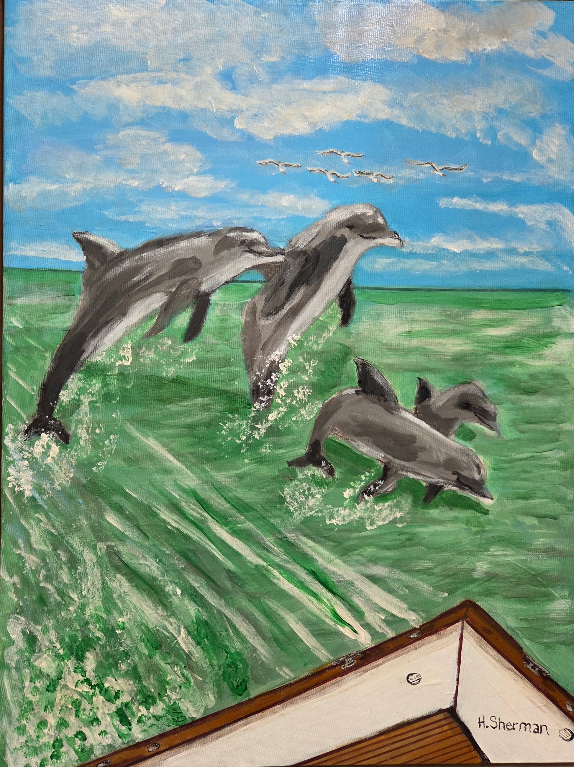 Family Outing -Print of acrylic on canvas painting by local South Florida artist Howard Sherman. Dive into the beauty of marine life with this stunning painting featuring a lively pod of dolphins gracefully leaping through the waves. Captured in a moment of joy and freedom, these playful creatures are depicted in lifelike detail against a vibrant backdrop of rich greens and bright blues, embodying the essence of oceanic adventure. The artist's skillful brushwork brings the dolphins to life, showcasing their sleek forms and dynamic movements as they splash through the water. Above, a clear sky dotted with seagulls adds to the scene's tranquility and natural beauty, making this piece a perfect tribute to the wonders of the sea.