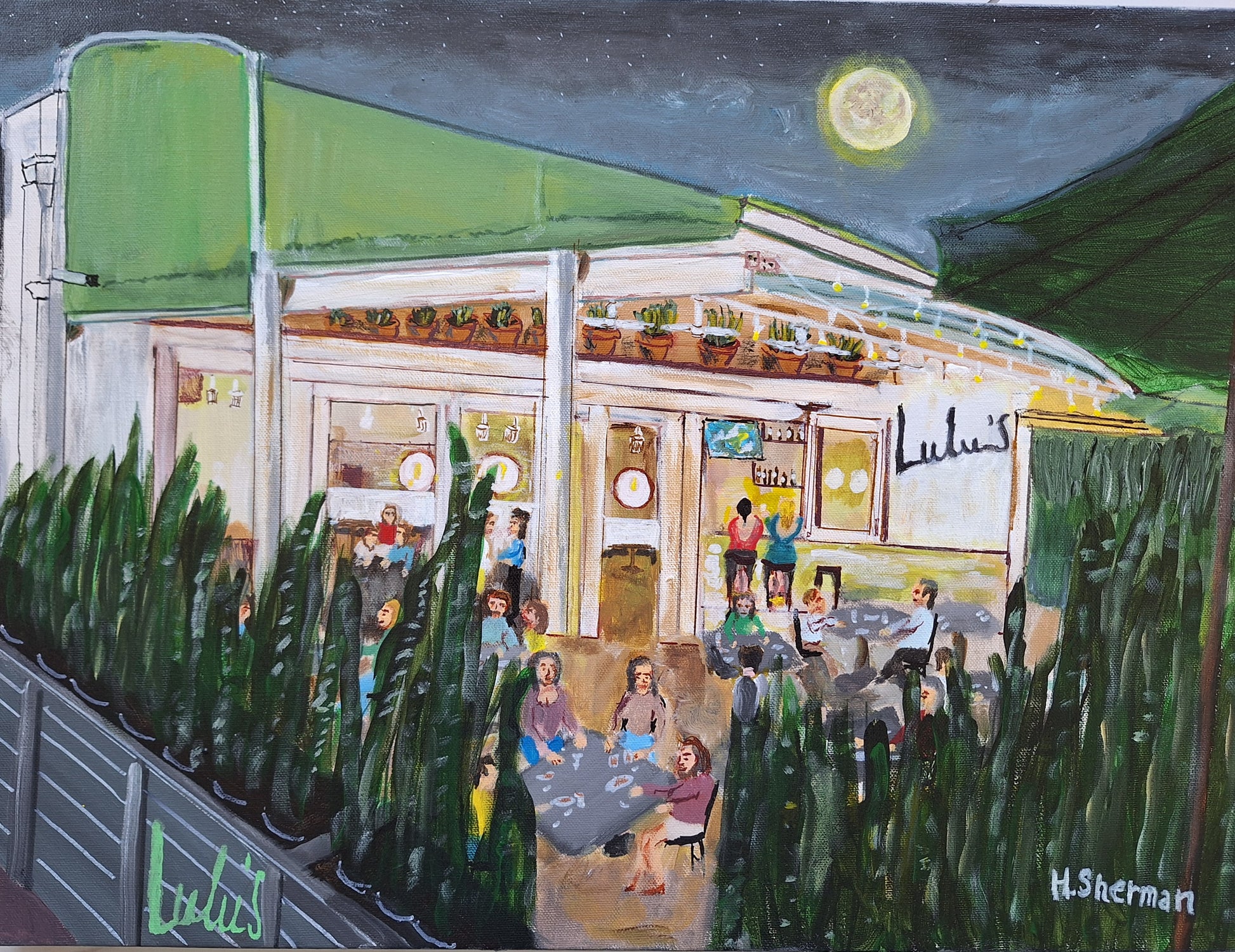 LULU'S -Acrylic on canvas painting by local South Florida artist Howard Sherman. Capture the essence of coastal dining with this vibrant painting of Lulu's in Delray Beach. The artist's use of bright colors and lively brush strokes brings the scene to life, reflecting the joy of dining and socializing in a beloved local spot. The illuminated windows and starry night sky contribute to the enchanting vibe, making this piece a perfect homage to the charm of Lulu's. Ideal for home decor, restaurant-themed spaces, or as a thoughtful gift for anyone who loves local dining experiences.