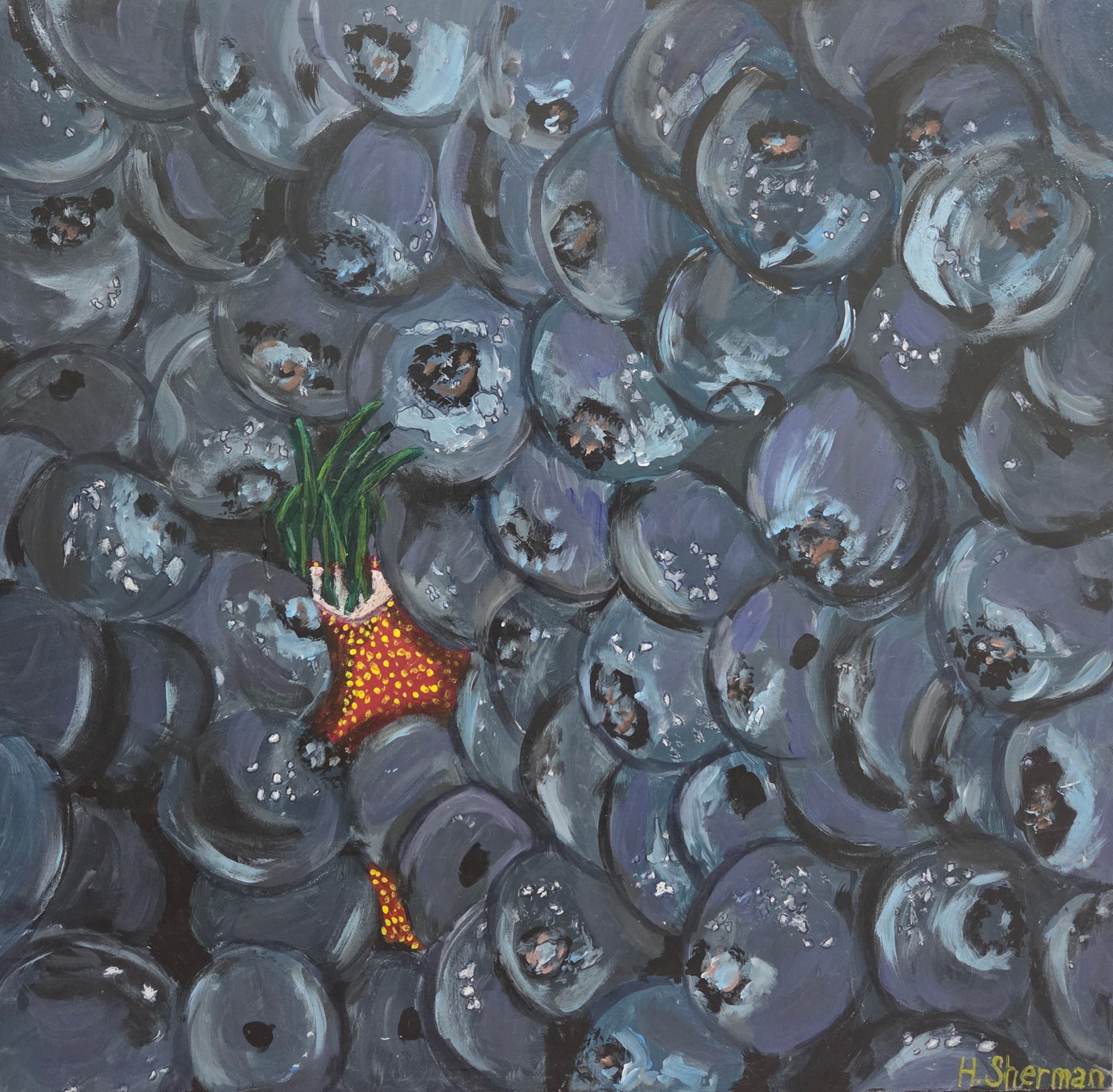 One Strawberry -An acrylic on canvas painting by local South Florida artist Howard Sherman. Explore the beauty of nature with this stunning still life painting that showcases a bountiful arrangement of blueberries. Deep blues and bright oranges create a striking visual contrast that energizes the artwork. A thoughtful gift for chefs, food enthusiasts, or anyone who enjoys colorful art.