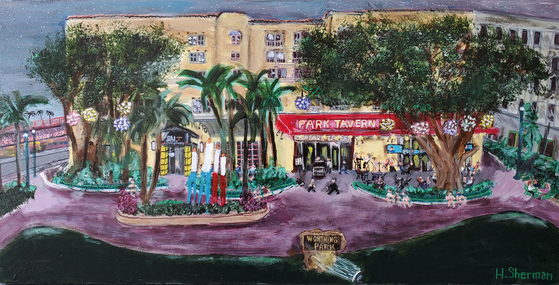 Park Tavern and Worthing Park -An acrylic painting by local South Florida artist Howard Sherman. A piece that represents community and camaraderie for Delray Beach locals and visiting collectors who cherish the essence and charm of Atlantic Ave. A unique present for foodies, nightlife enthusiasts, or anyone who loves local culture and vibrant art.