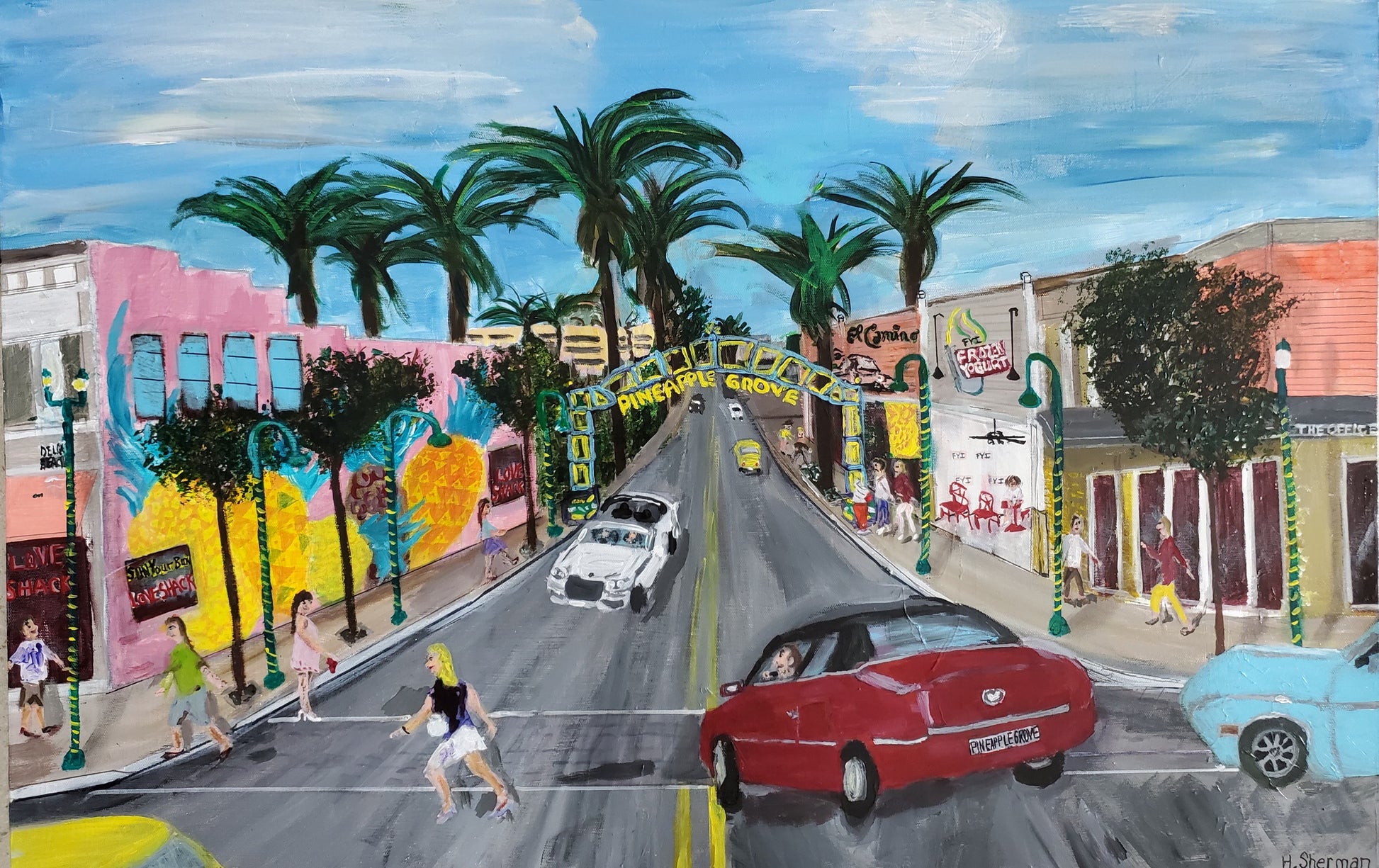 Pineapple Grove -Experience the vibrant charm of Pineapple Grove in Delray Beach with this captivating artwork. This stunning painting beautifully captures the essence of this lively district, known for its eclectic shops, art galleries, and inviting atmosphere. The vibrant colors and playful details bring the streets of Pineapple Grove to life.