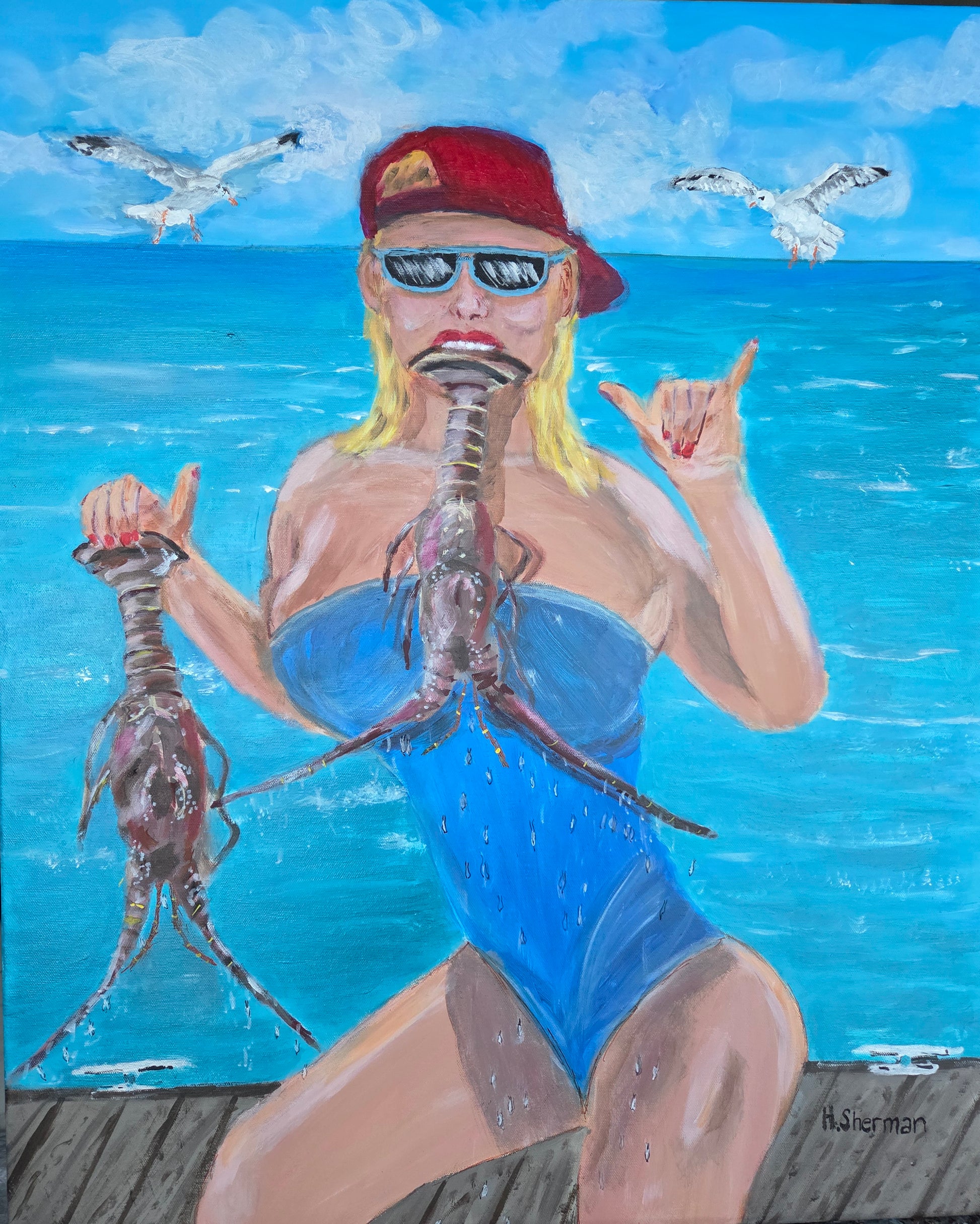 Prime Catch -Print of acrylic on canvas painting by local South Florida artist Howard Sherman. Dive into the playful spirit of coastal life with this lively painting showcasing a confident woman proudly displaying her fresh catch of lobsters. This artwork is perfect for anyone who loves the beach lifestyle, seafood, or simply appreciates vibrant and fun art. A thoughtful gift for beach enthusiasts, seafood lovers, or anyone who enjoys lighthearted art.