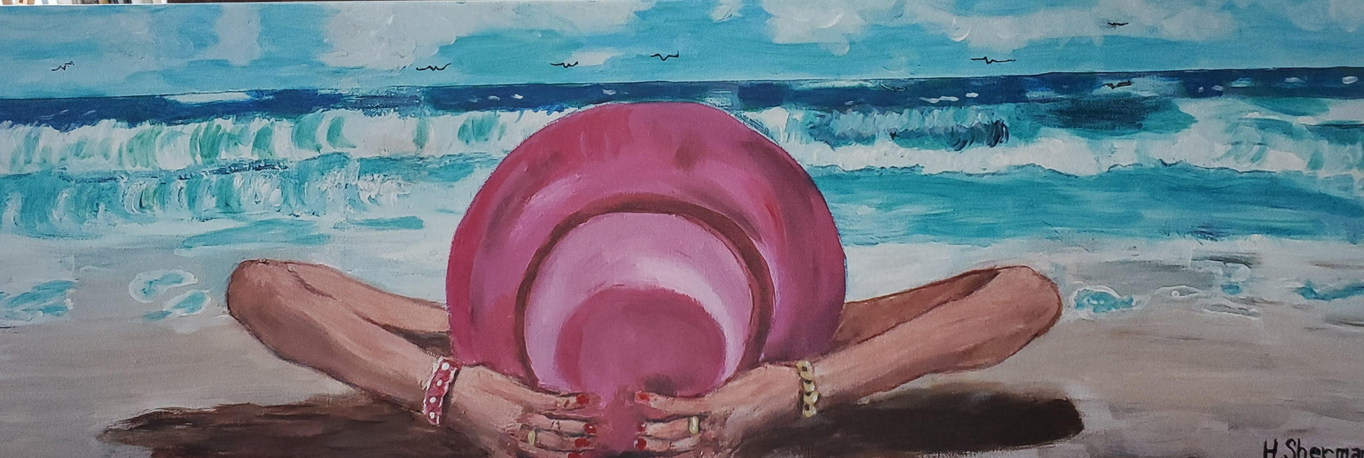 Relaxing on the Beach -An acrylic on canvas painting by local South Florida artist Howard Sherman. Bold colors and soft brush strokes evokes the essence of a perfect beach day, making this piece a delightful addition to any art collection. Whether you’re a beach lover or simply appreciate the beauty of nature, this artwork is sure to bring warmth and tranquillity to any bedroom, living room, or vacation home.