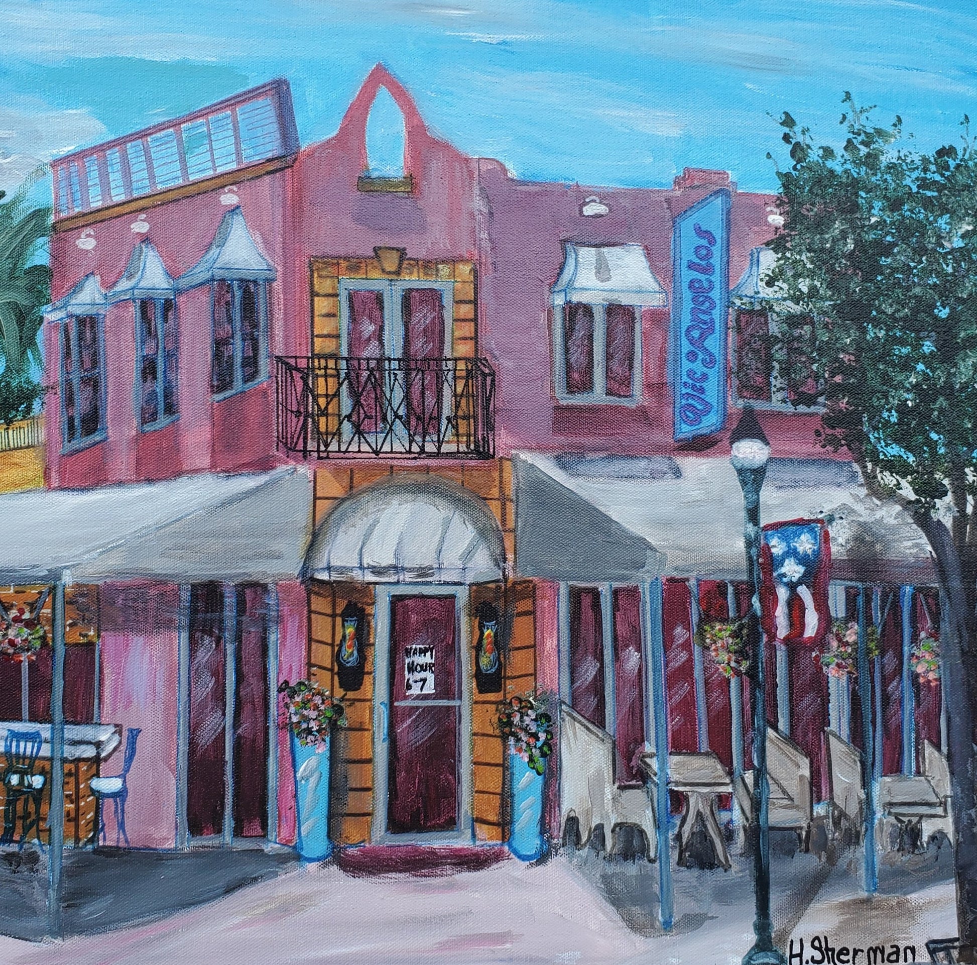 Vic & Angelos -An acrylic on canvas painting by local South Florida artist Howard Sherman. This contemporary artwork features Delray's beloved, family owned Italian restaurant, Vic & Angelos. A recognizable scene for locals, capturing the essence of warmth and community of dining on Atlantic Ave. A perfect gift for local and visiting collectors to add the charm of downtown Delray Beach into homes or offices.